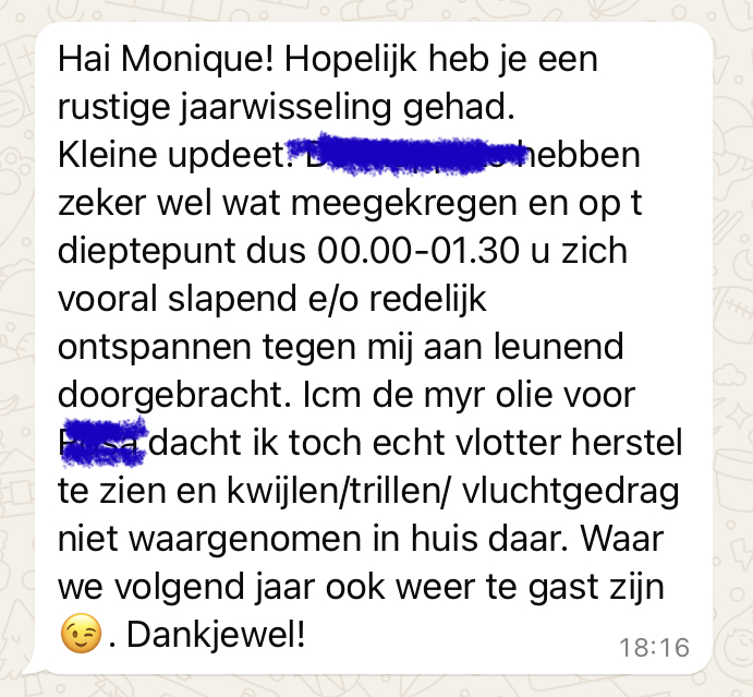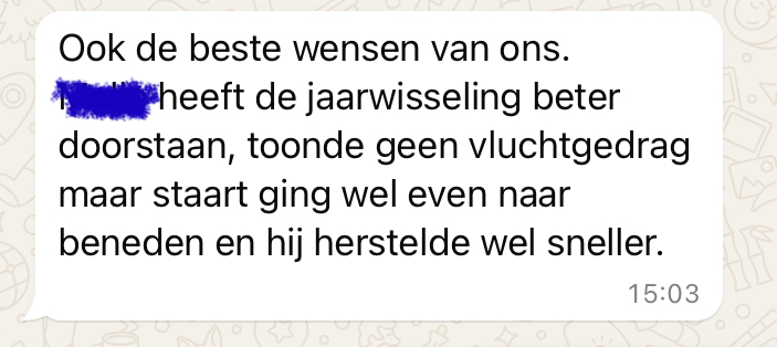 De healing was ’s ochtends, het filmpje is net na 00.00 uur opgenomen. Je ziet het vuurwerk flitsen, de hond is heel ontspannen met zijn kluifje bezig… <3