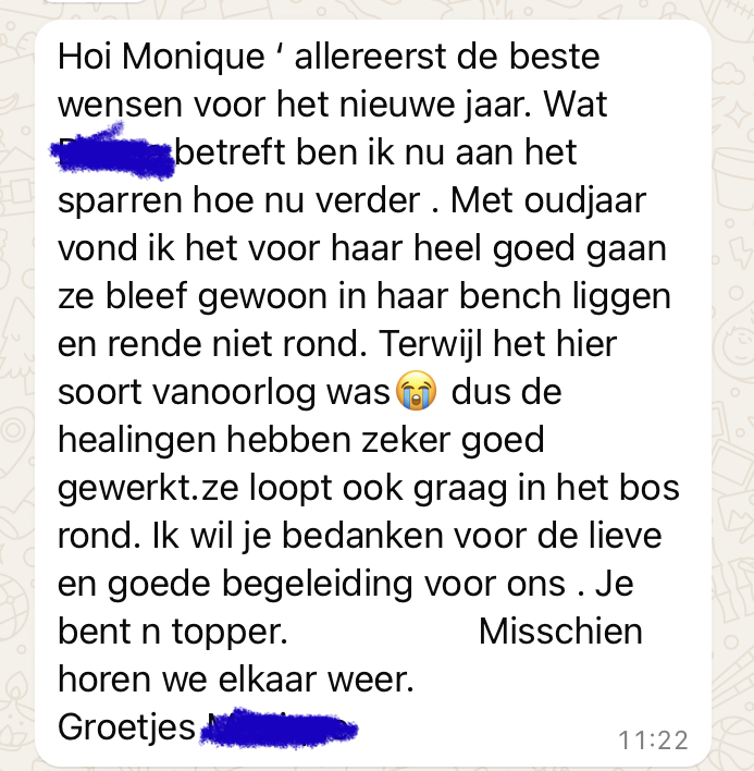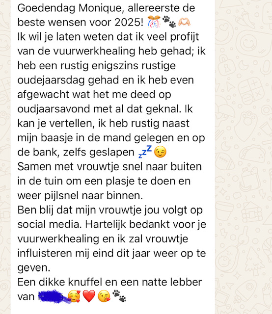 Oudejaarsdag vuurwerk healing; op oudjaarsdag 2022 heb ik voor de honden met vuurwerkstress een gratis groepshealing verzorgd. Zooo ontzettend fijn om bij te dragen aan het welzijn van deze honden!